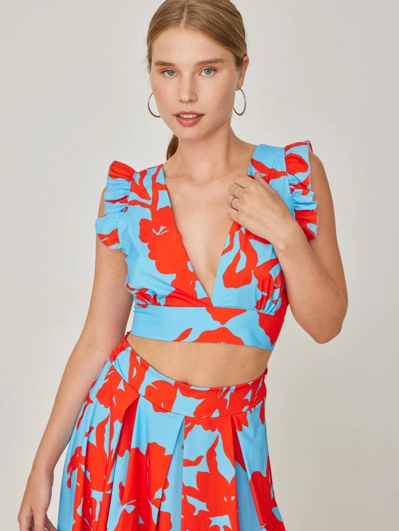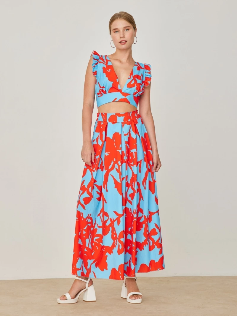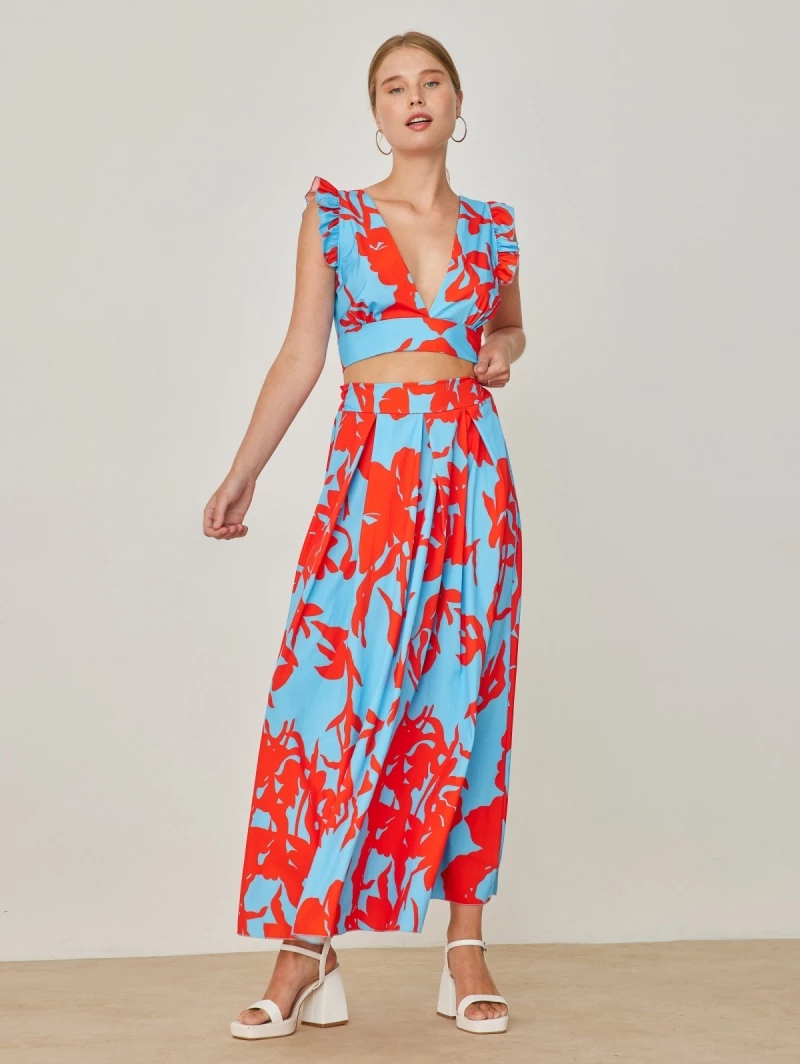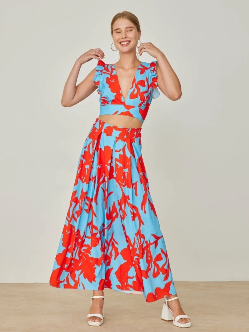 Σετ ρούχων με σχέδιο σε συνδυασμούς χρωμάτων. Το τοπ έχει δέιμο στο πίσω μέρος και βολάν στα μανίκια. Η φούστα έχει λάστιχο στη μέση και πιέτες στη μπροστινή πλευρά. Άνετη γραμμή.Made in Italy.