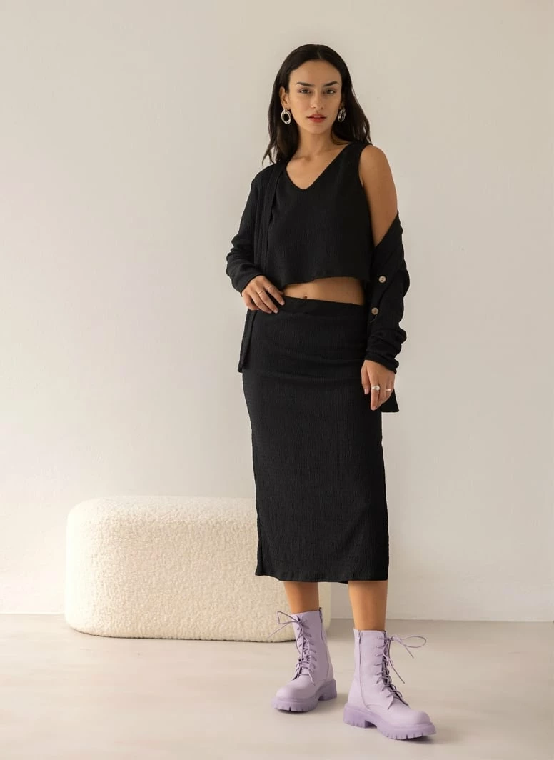 Σετ φούστα γκοφρέ με τοπ και ζακετάκι. Το τοπ είναι κοντομάνικο σε φαρδιά γραμμή με V λαιμόκοψη. Η φούστα είναι pencil με σχίσιμο στο πλάι. Στη μέση έχει λάστιχο.