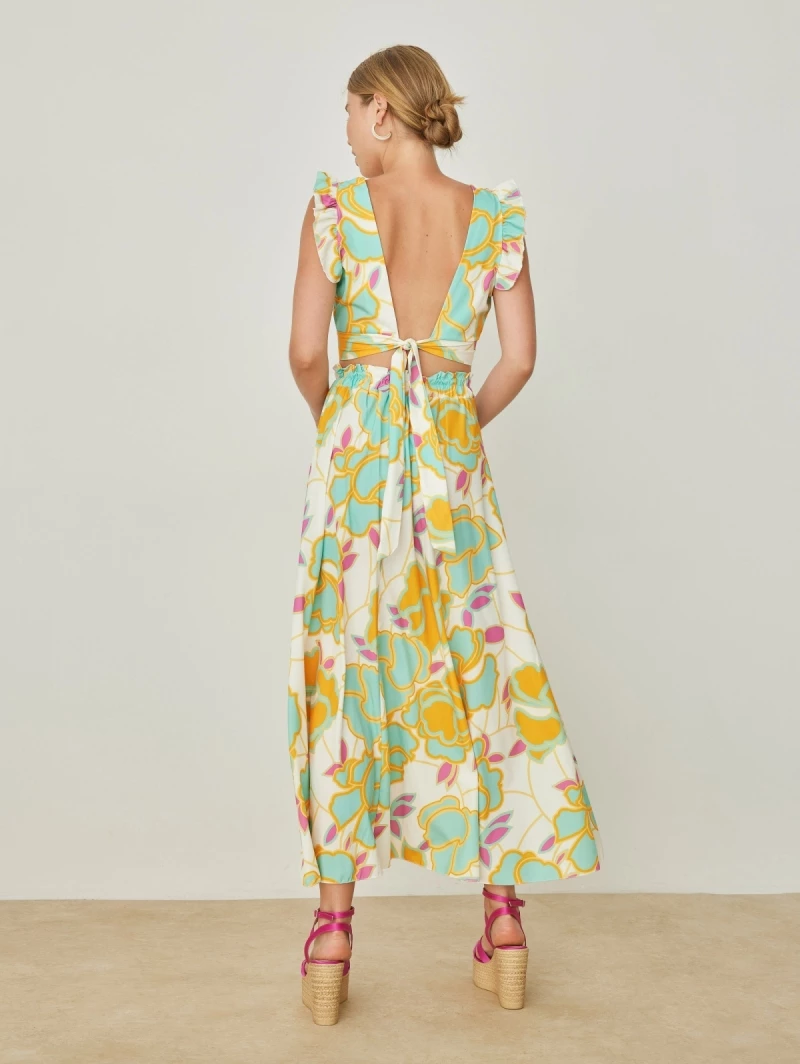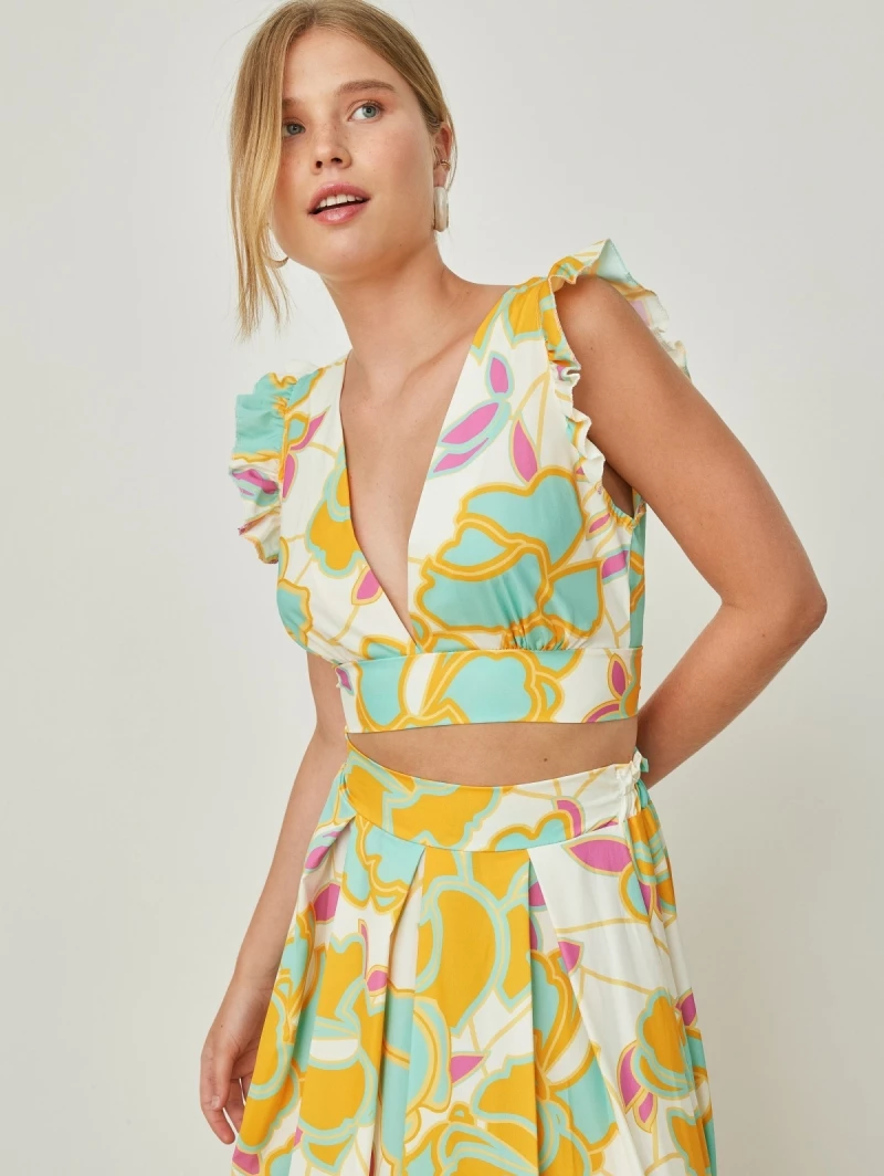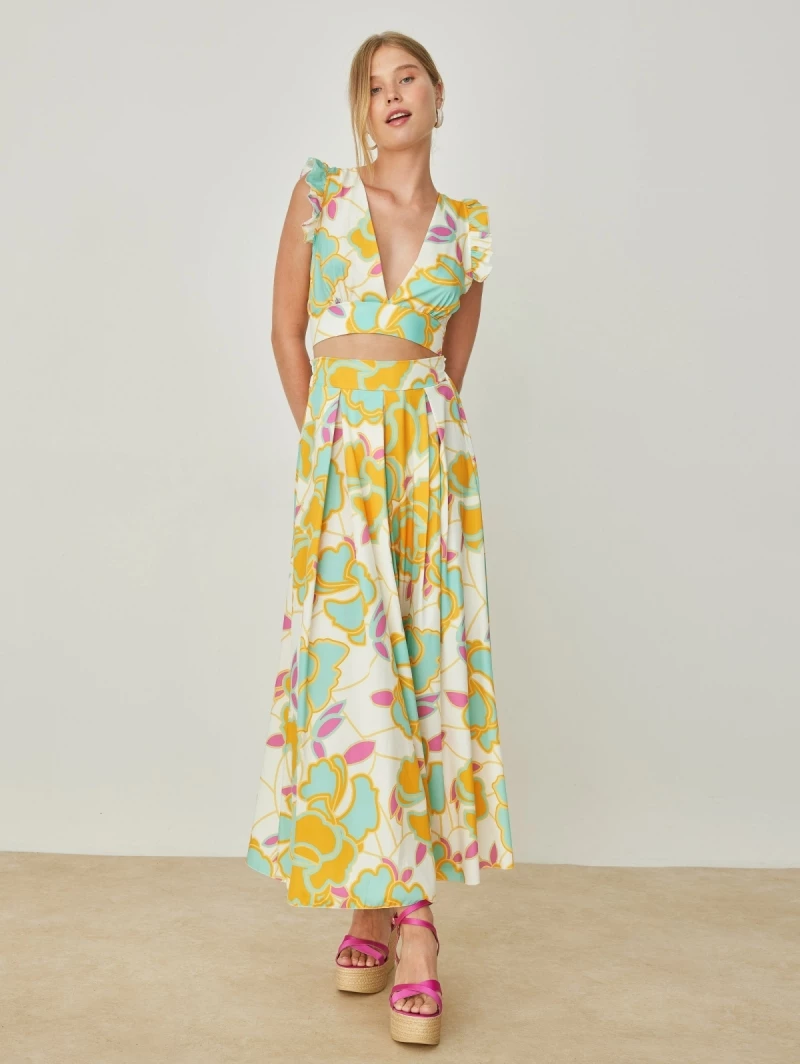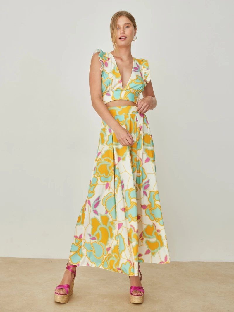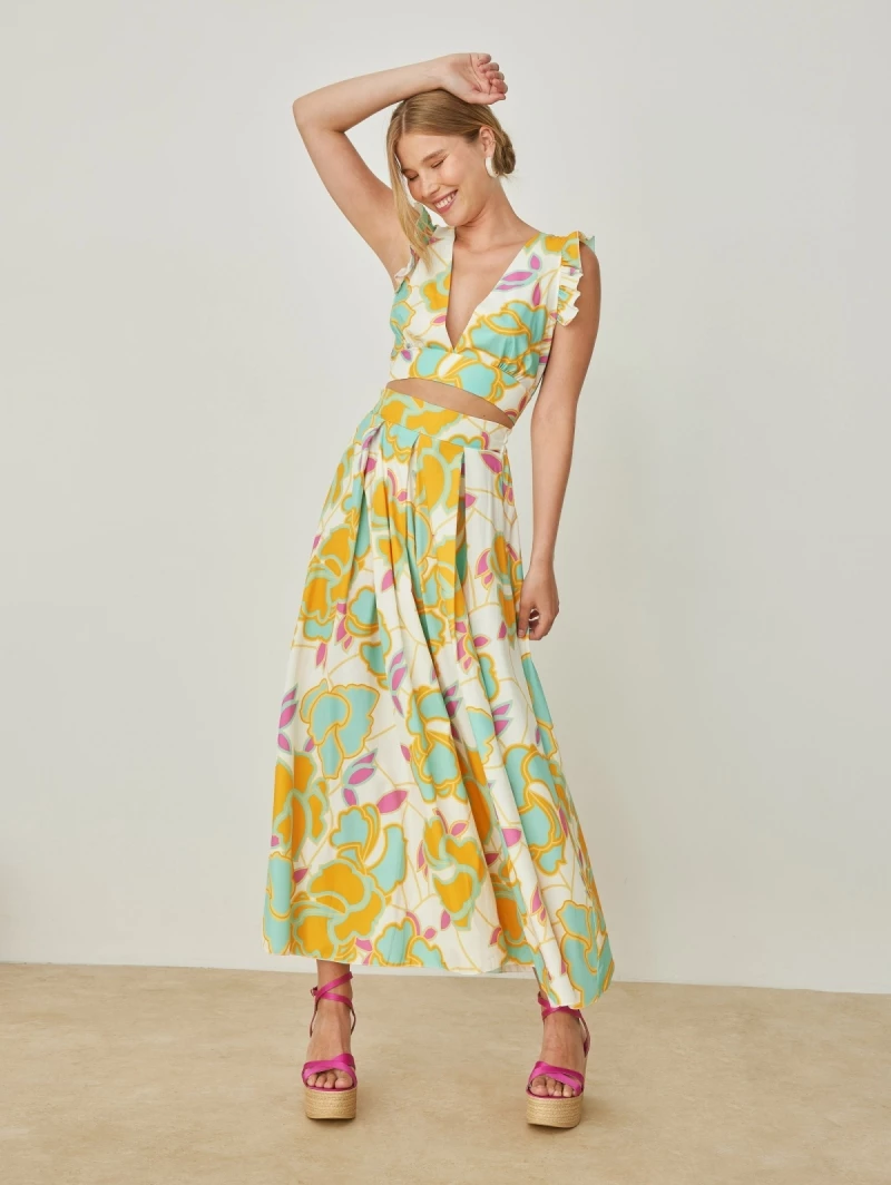 Σετ ρούχων με μεγάλα λουλούδια. Το τοπ είναι αμάνικο με βολάν στους ώμου. Δένει στο πίσω μέρος. Η φούστα είναι μάξι με κόμπο και πιέτες στη μπροστινή πλευρά. Made in Italy.
