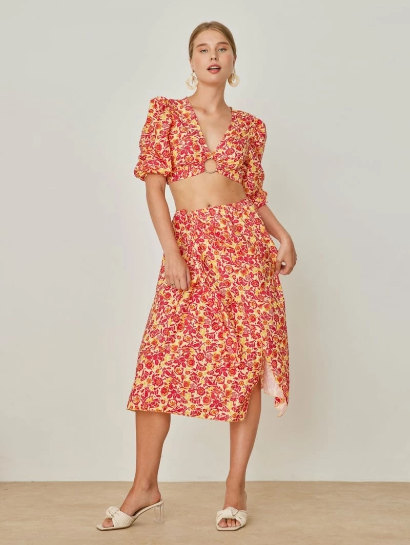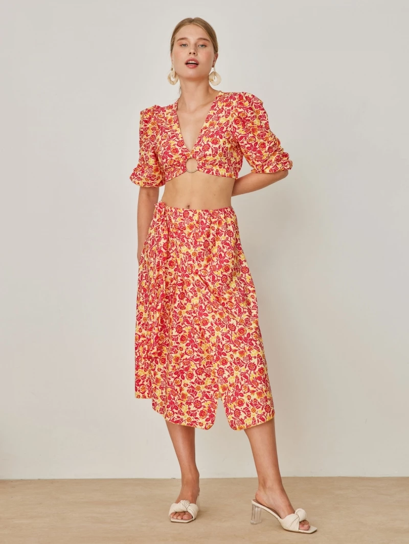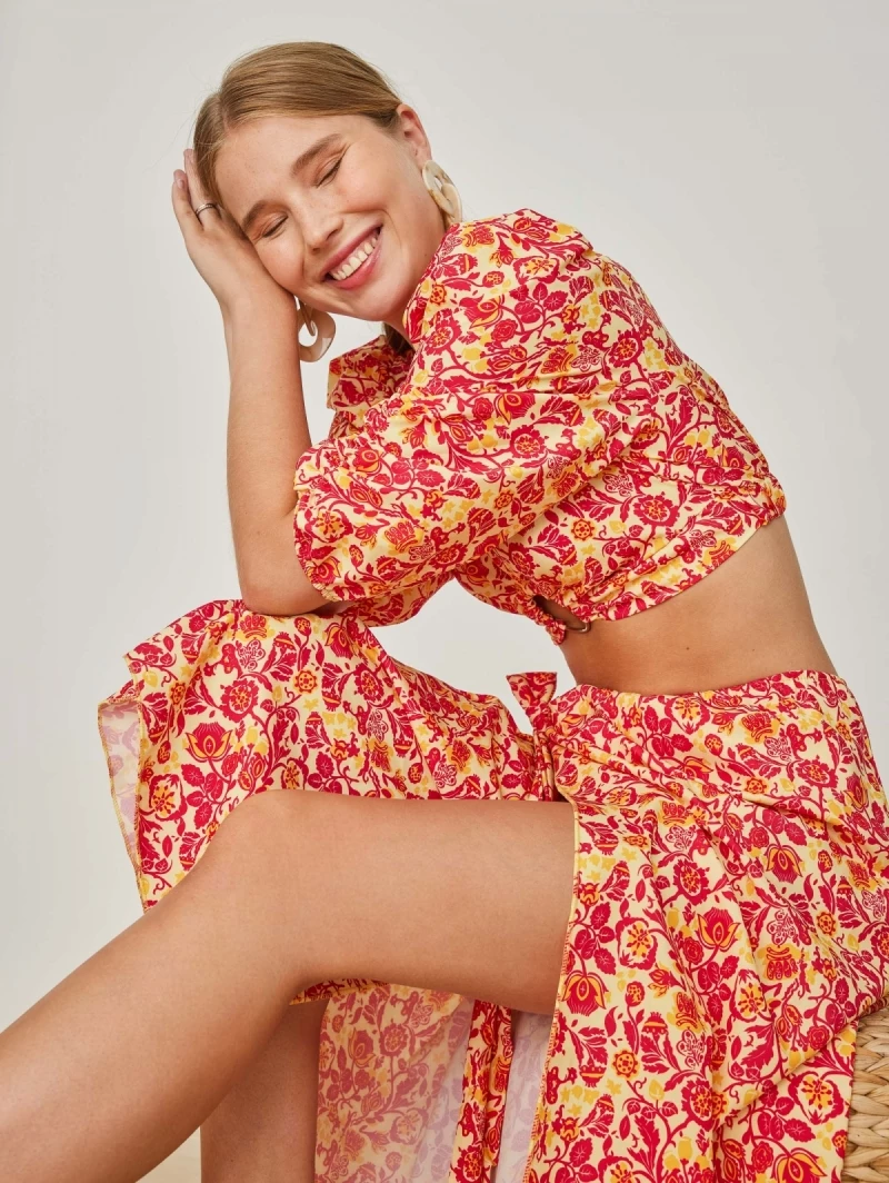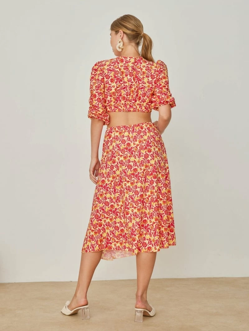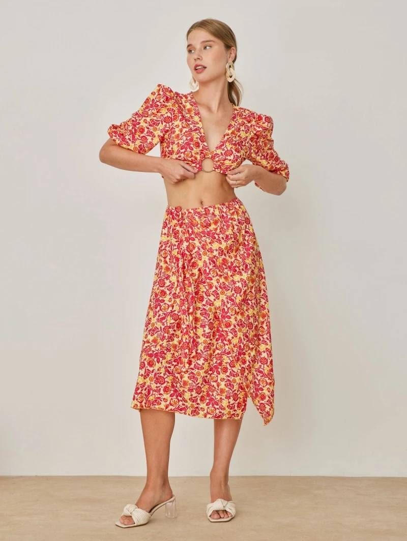Σετ ρούχων. Η φούστα έχει άνοιγμα στο πλάι και δετό ζωνάκι. Λάστιχο στη μέση. Το τοπ έχει vcut λαιμόκοψη και κρίκο στη μπροστινή πλευρά. Λάστιχο στα μανίκια και το τελείωμα. Made in Italy.