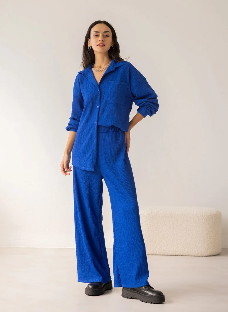 Σετ παντελόνα με πουκάμισο από γκοφρέ ύφασμα. Η παντελόνα έχει λάστιχο στην μέση. Το πουκάμισο έχει τσεπάκι στο μπροστινό μέρος. Άνετη γραμμή.