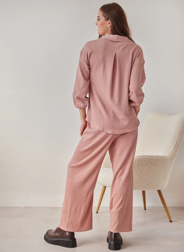 Σετ παντελόνα με πουκάμισο από γκοφρέ ύφασμα. Η παντελόνα έχει λάστιχο στην μέση. Το πουκάμισο έχει τσεπάκι στο μπροστινό μέρος. Άνετη γραμμή.