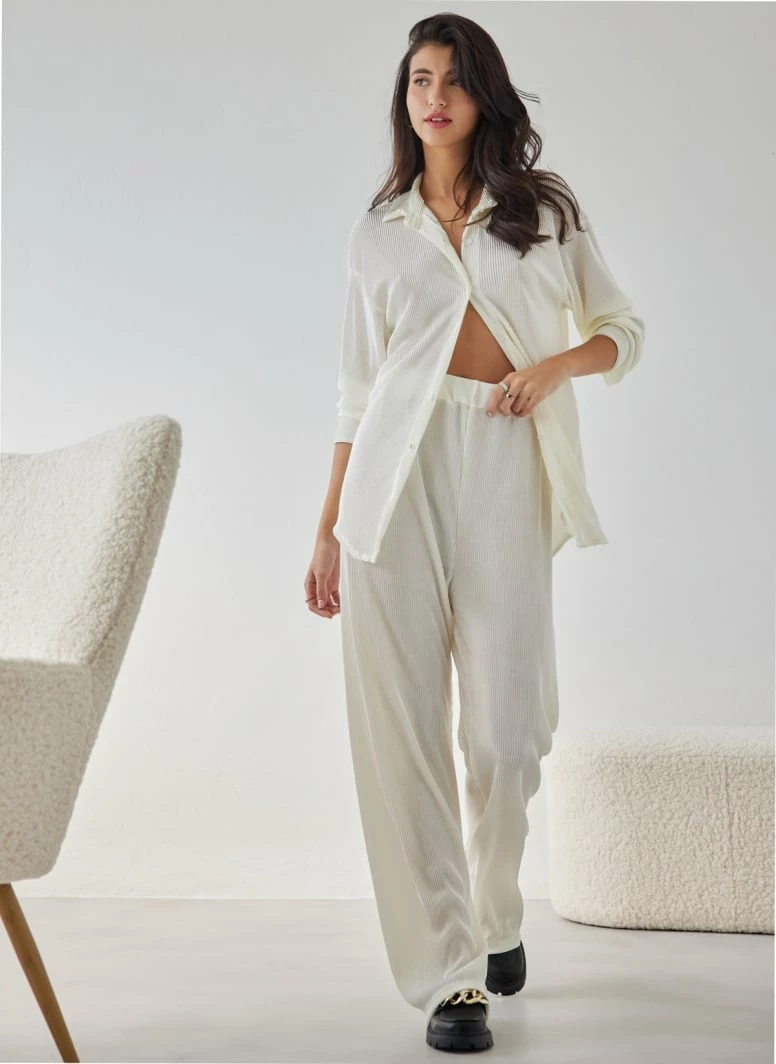 Σετ γκοφρέ ρούχων. Το πουκάμισο έχει oversized γραμμή με οβάλ τελείωμα. Το παντελόνι είναι wideleg ψηλόμεσο με λάστιχο. Made in Italy.