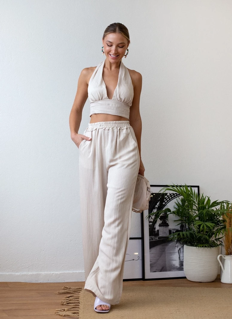 Σετ ρούχων λινό. Το παντελόνι είναι wide leg με λάστιχο στη μέση. Έχει τσέπες στο πλάι. Το τοπάκι έχει ενίσχυση. Δένει στην πλάτη και το λαιμό. Cropped Γραμμή.
