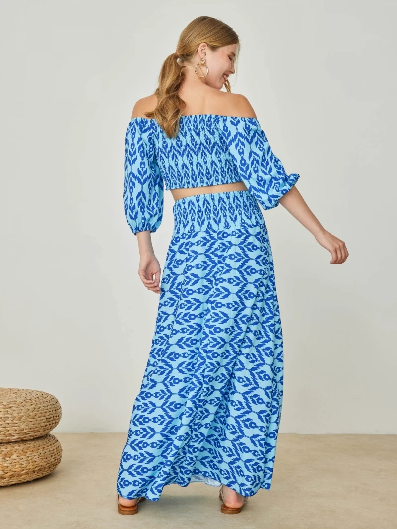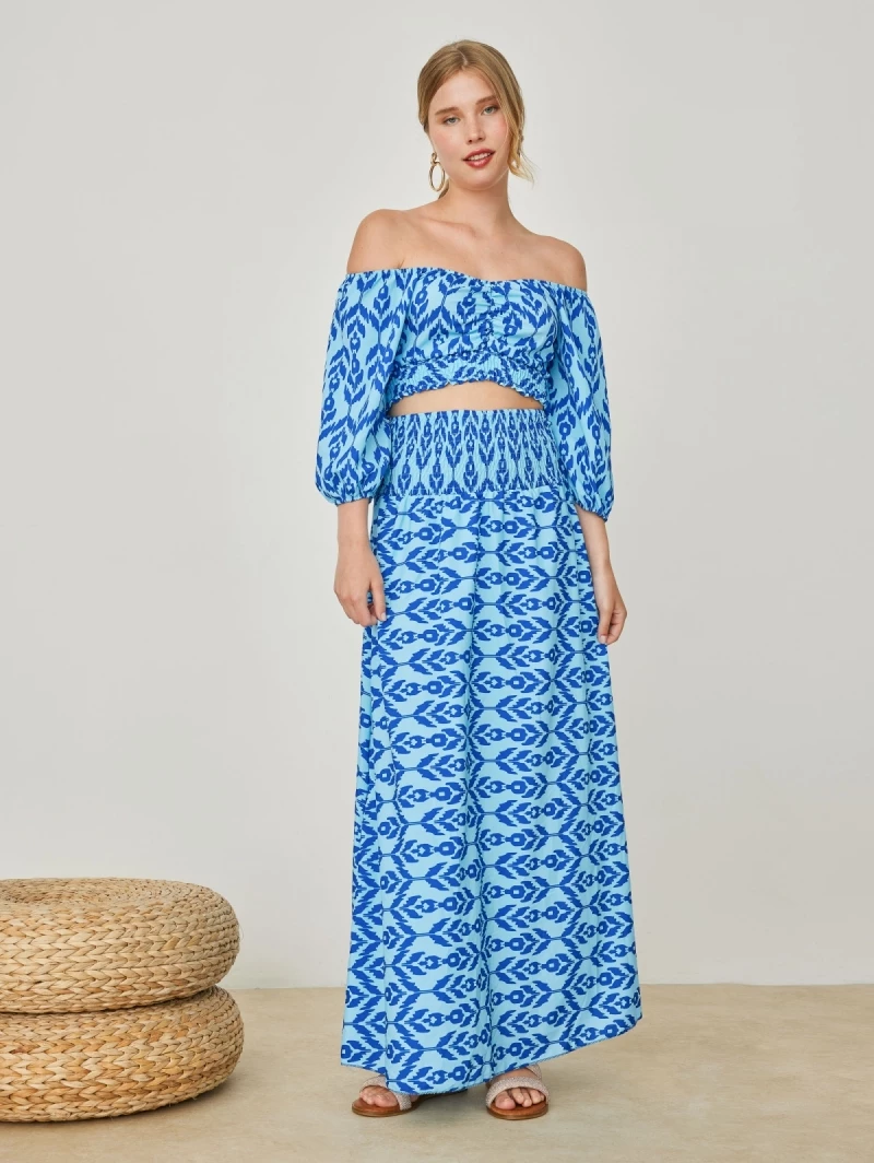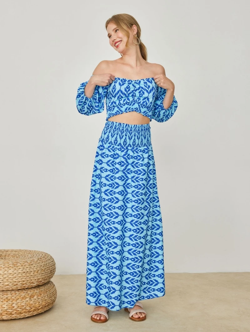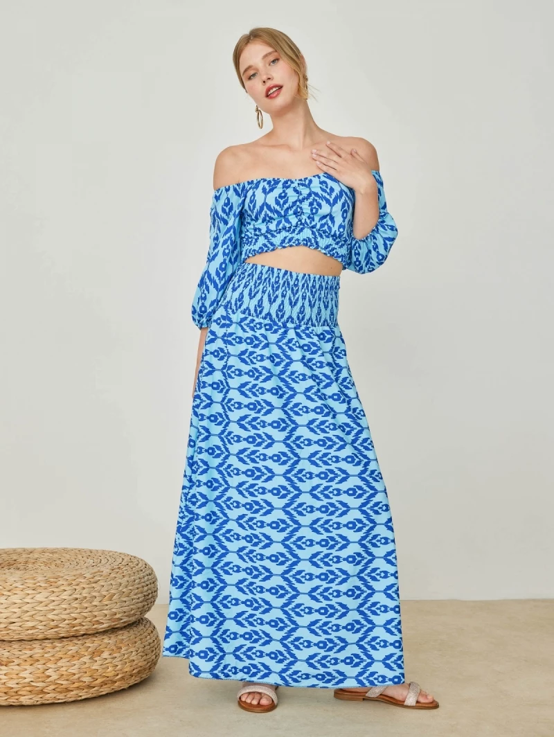 Σετ ρούχων με pattern. H φούστα είναι μάξι με flilled λάστιχο στη μέση. Το τοπ έχει λάστιχο στα μανίκια και το τελείωμα. Cropped γραμμή.