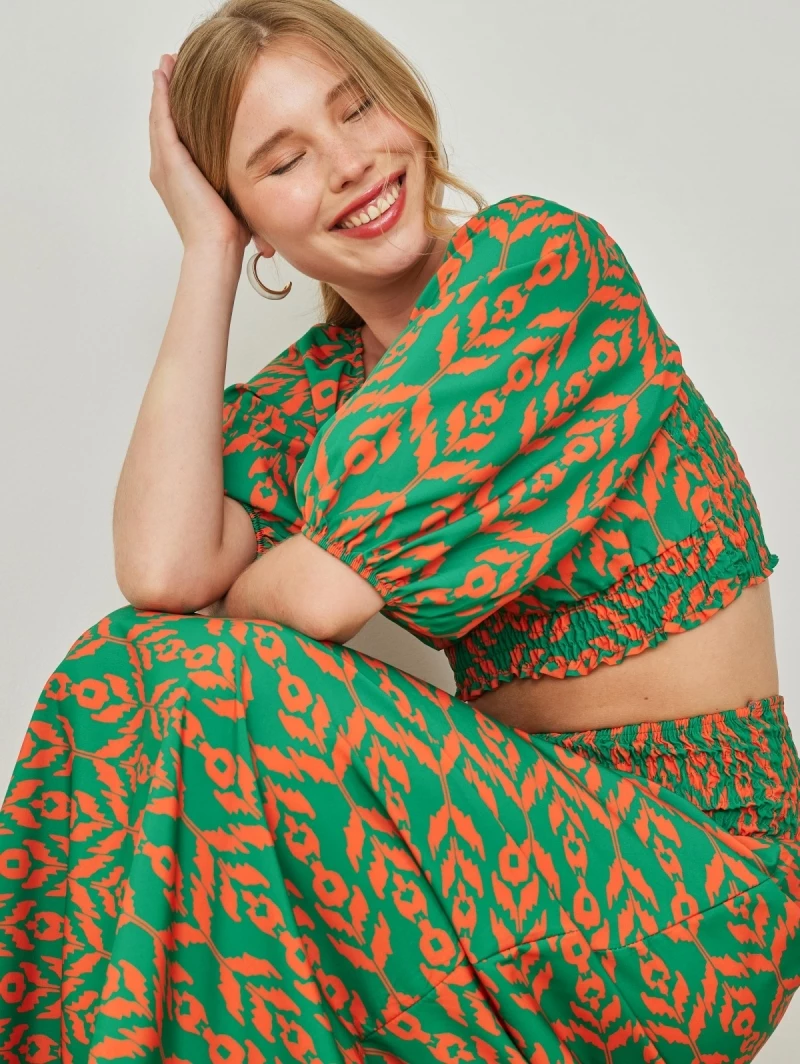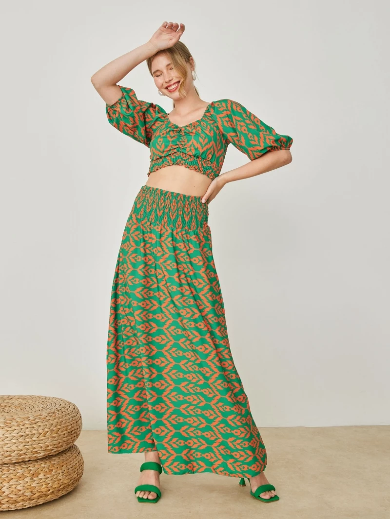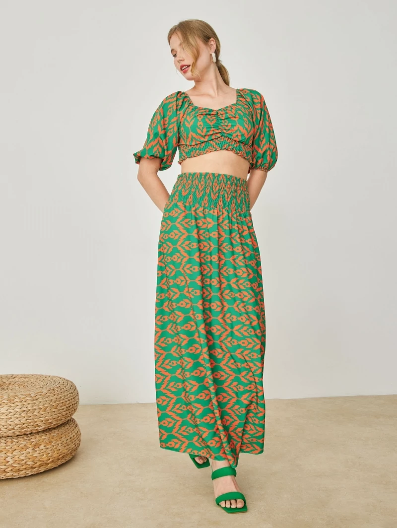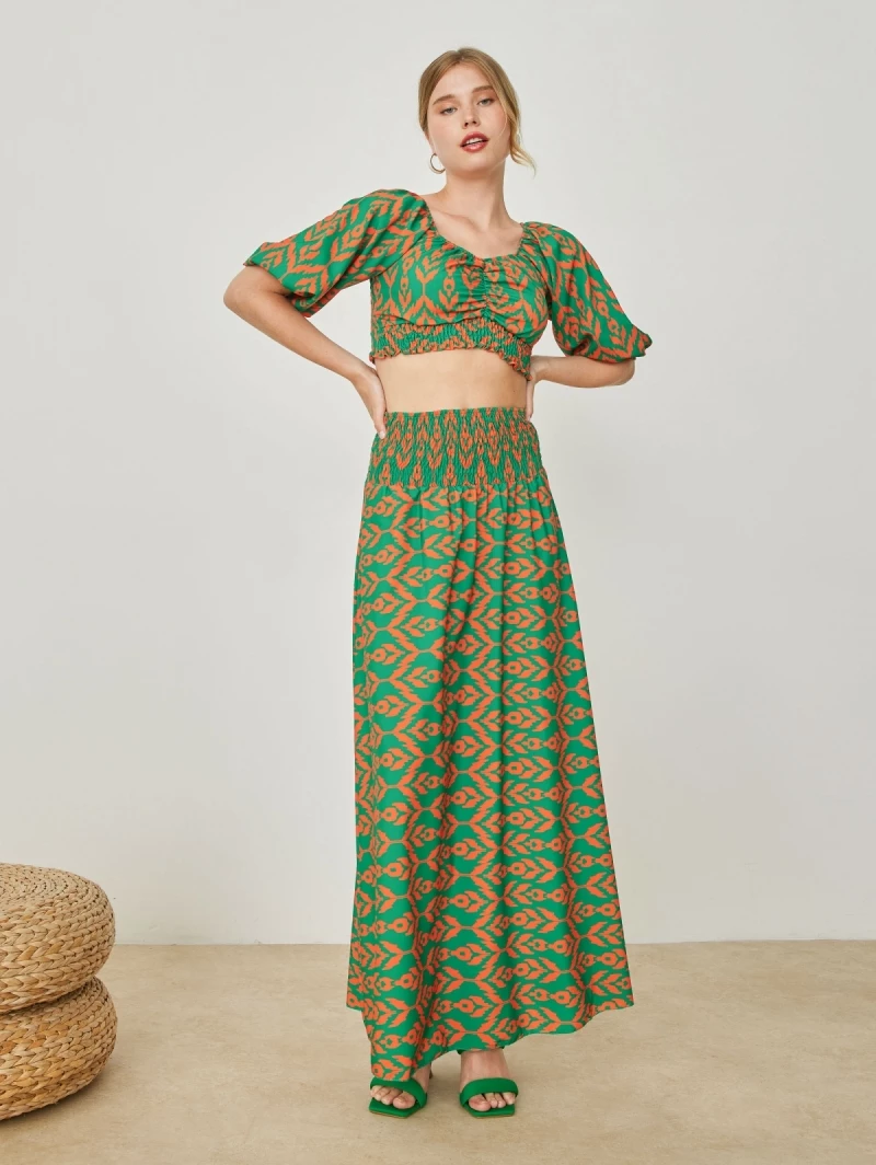 Σετ ρούχων με pattern. H φούστα είναι μάξι με flilled λάστιχο στη μέση. Το τοπ έχει λάστιχο στα μανίκια και το τελείωμα. Cropped γραμμή.