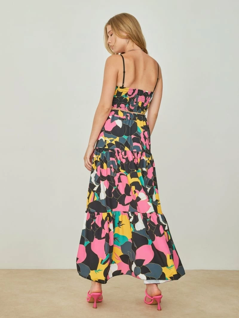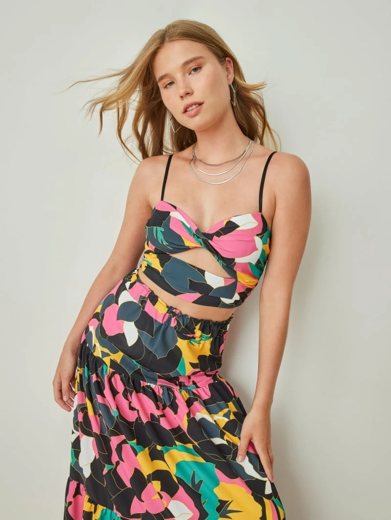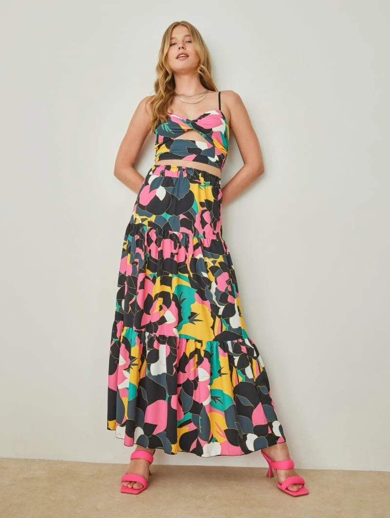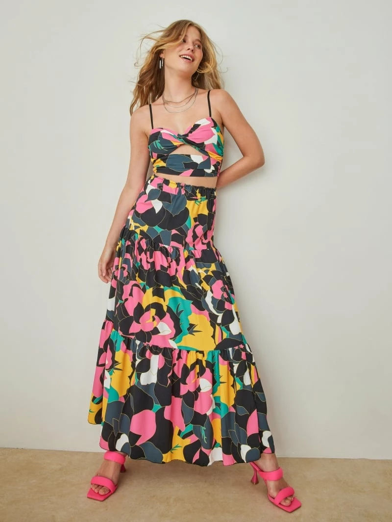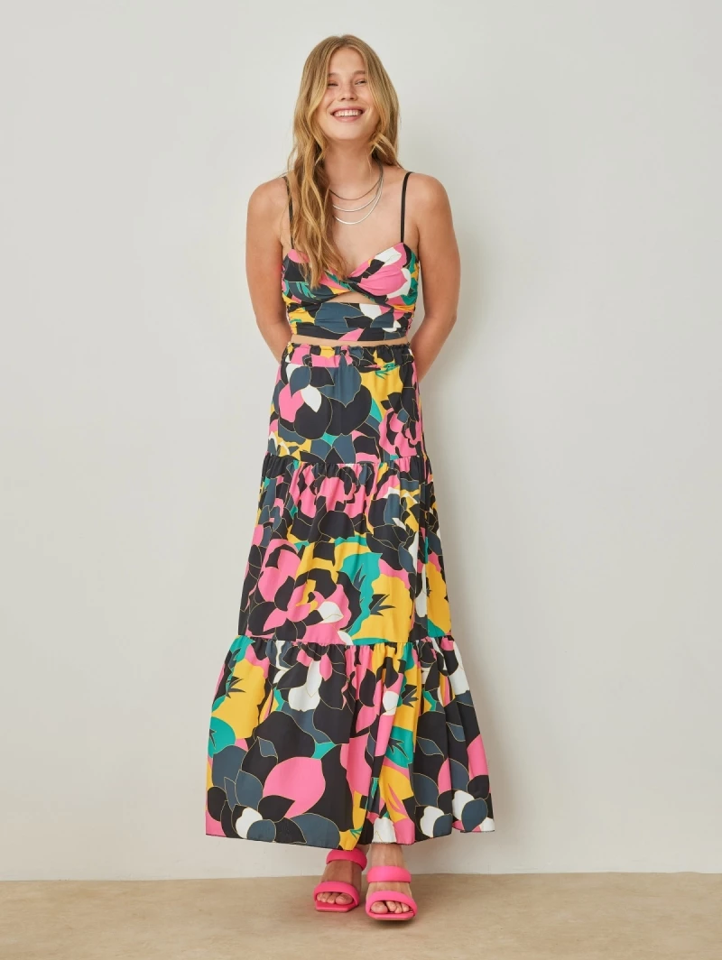 Σετ ρούχων με σχέδιο σε συνδυασμούς χρωμάτων. Το τοπ είναι μπουστάκι με σταθερή ενίσχυση και άνοιγμα. Η φούστα είναι μάξι με βολάν και ελαστική μέση. Made in Italy.