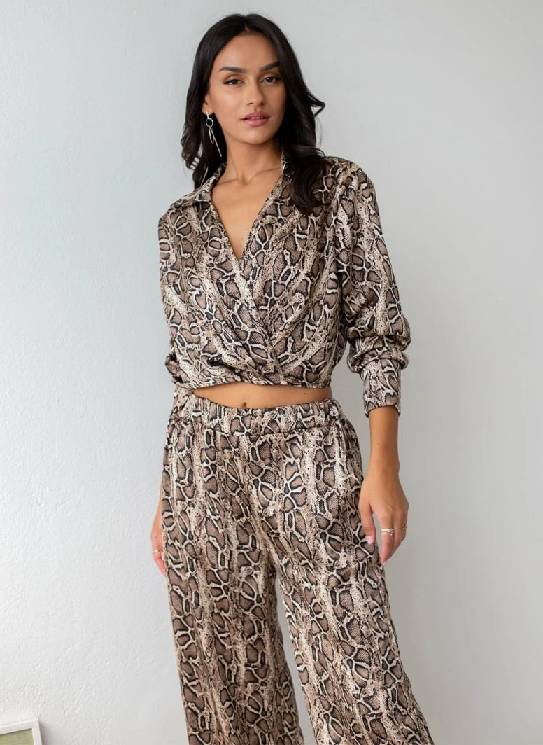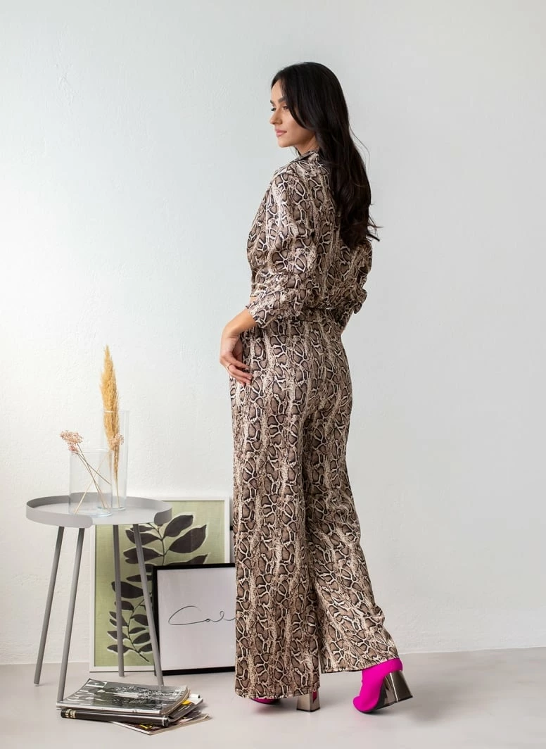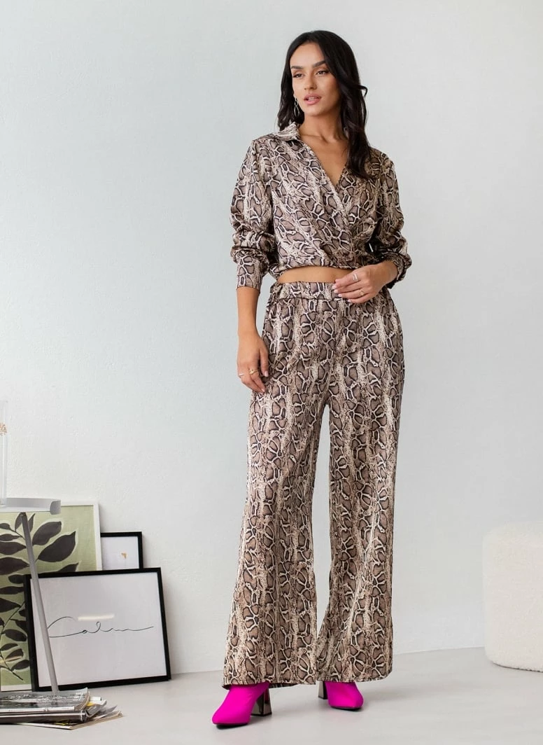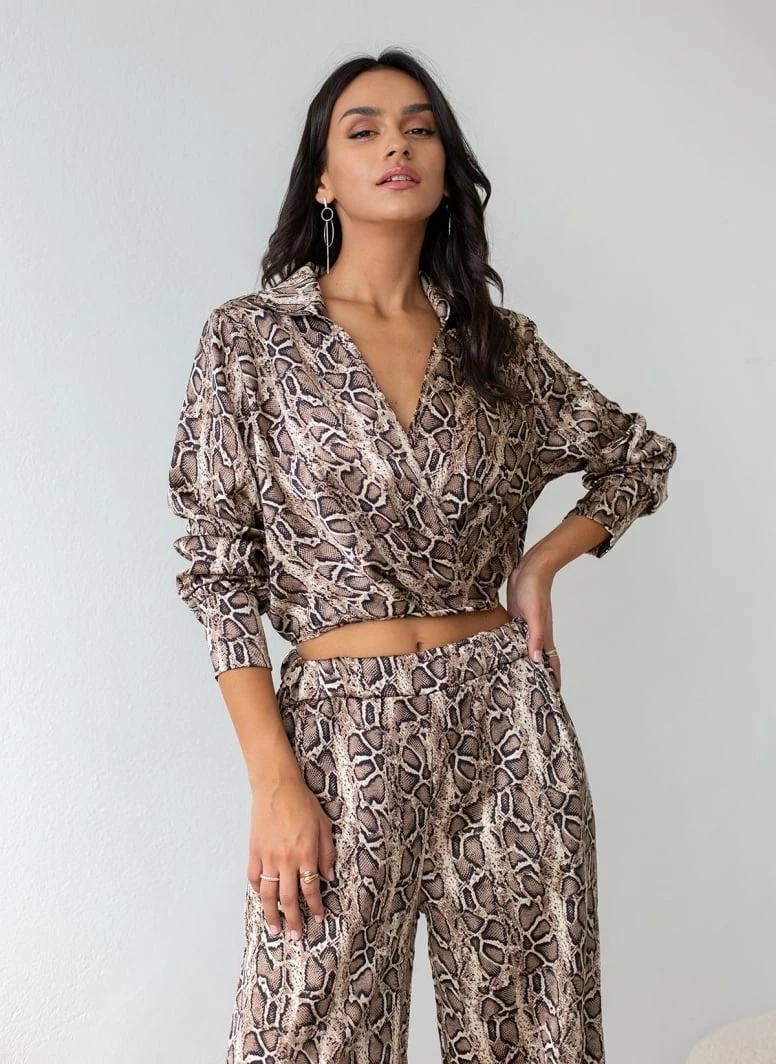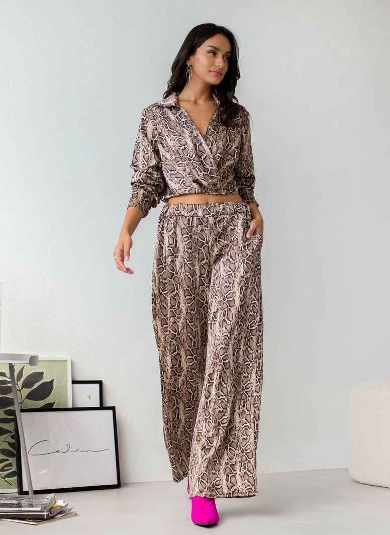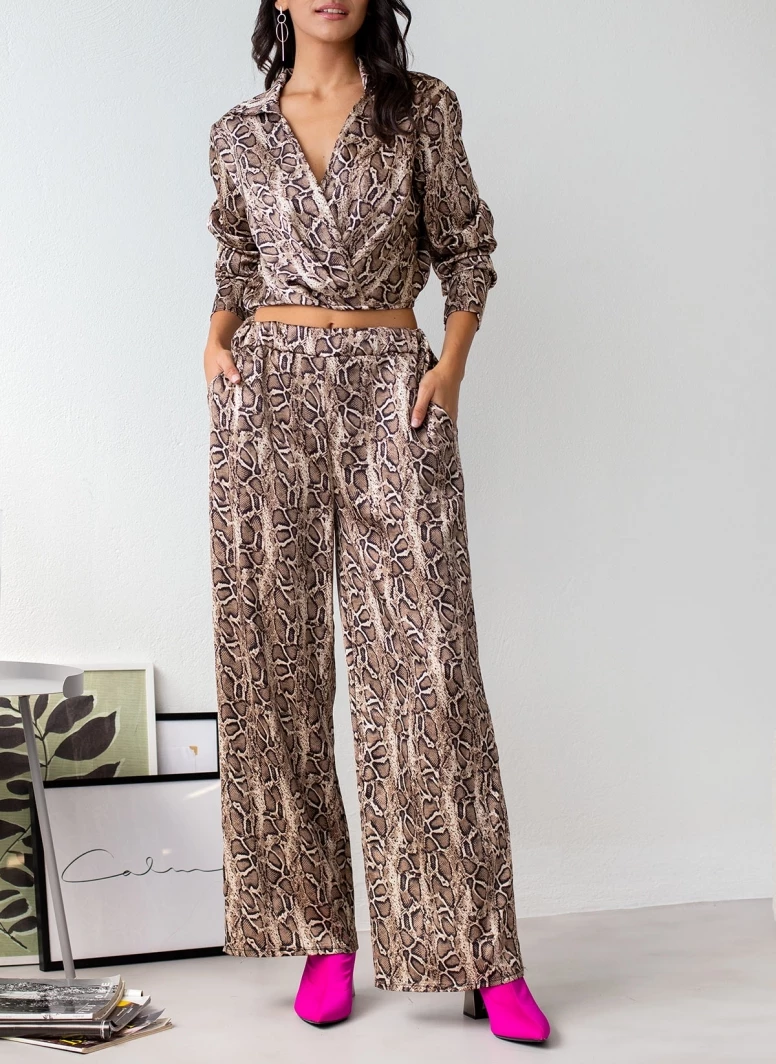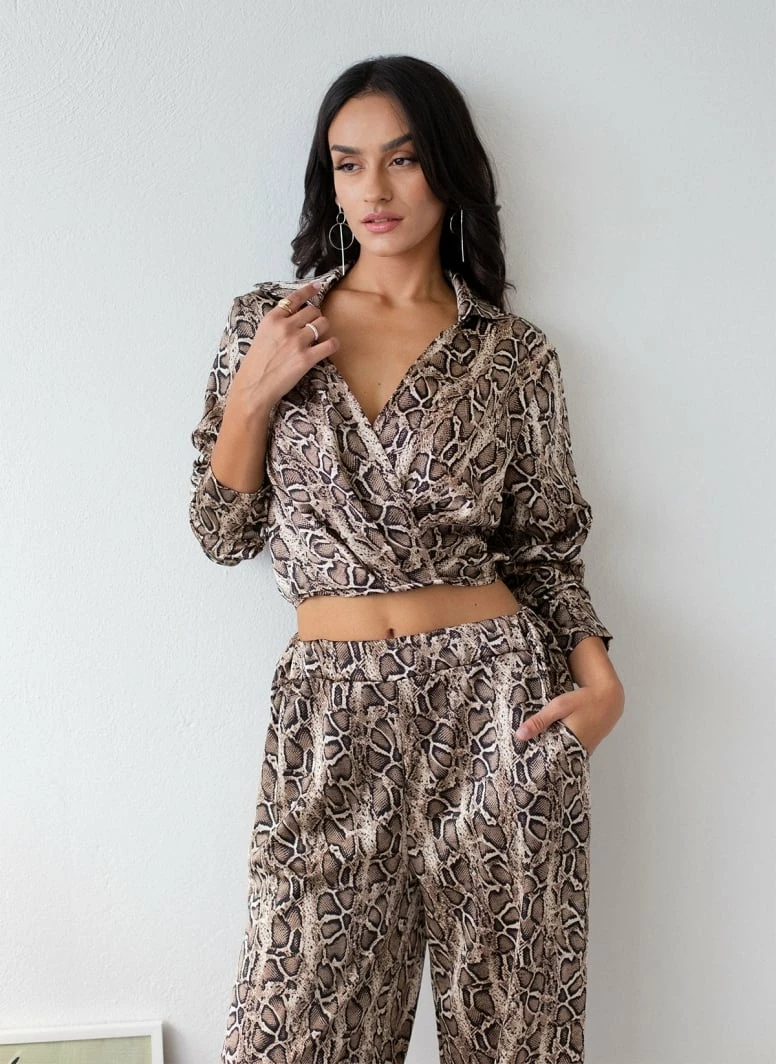 Σετ παντελόνα animal print με top. Η παντελόνα έχει λάστιχο στη μέση και τσέπες. Το top είναι κρουαζέ με μακριά μανίκια και γιακά.