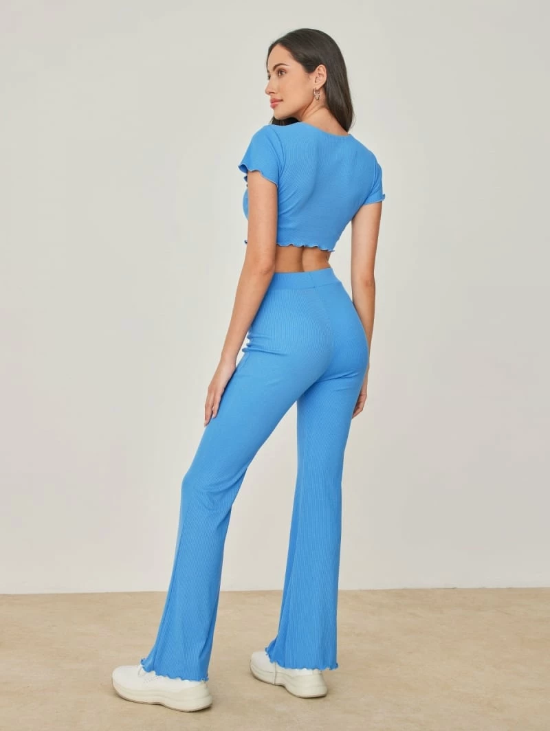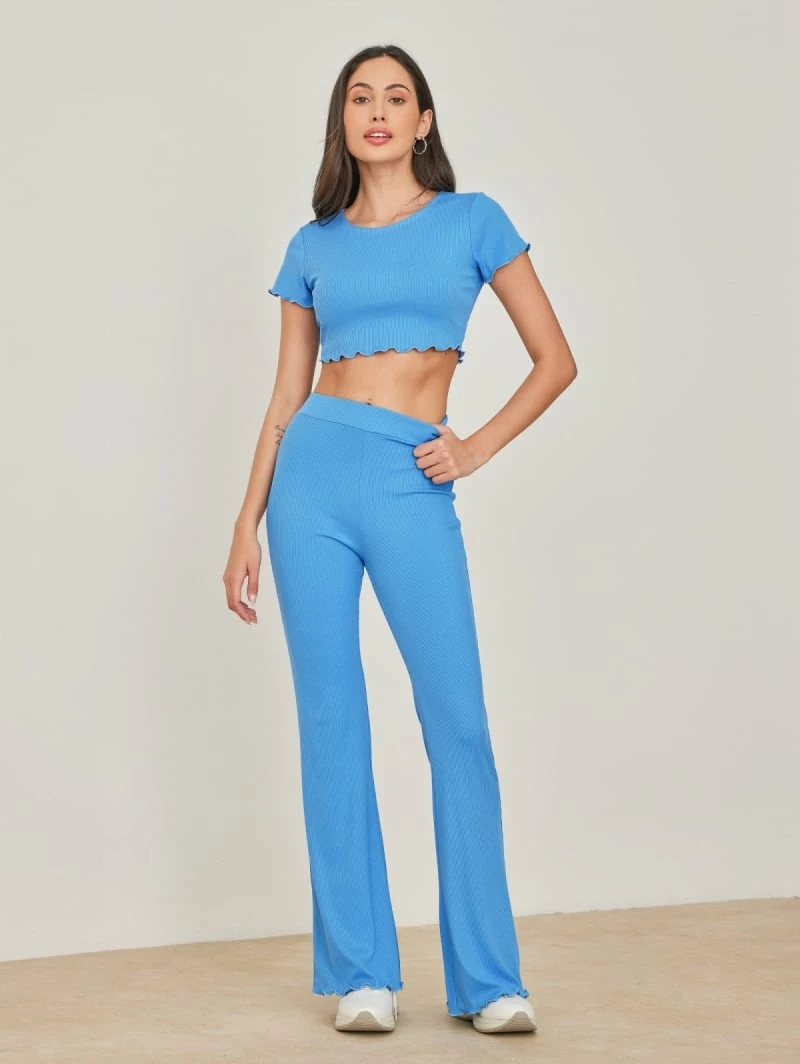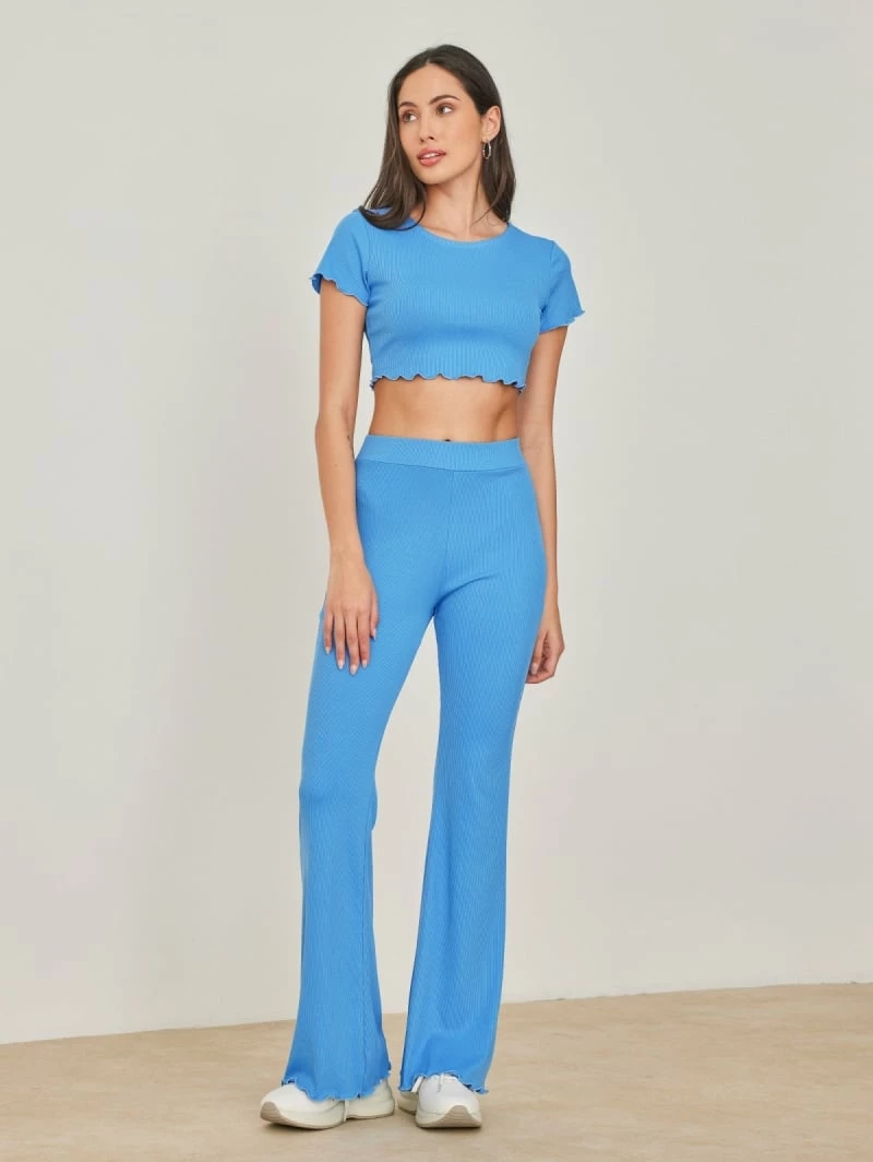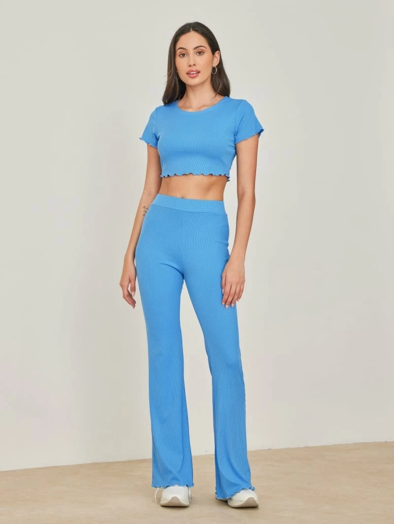 Σετ ριπ παντελόνι με μπλουζάκι. Στο τελείωμα τους έχουν βολάν. Το παντελόνι έχει φαρδιά γραμμή και λάστιχο στη μέση. Το τοπ είναι κοντομάνικο σε cropped γραμμή.