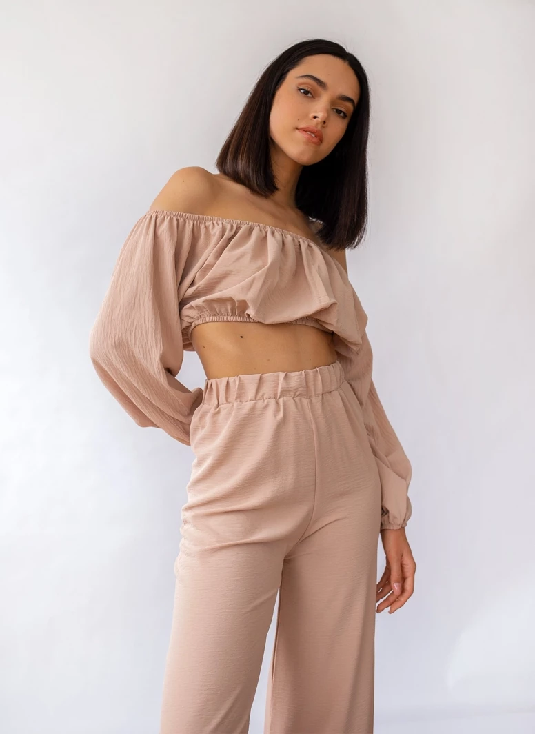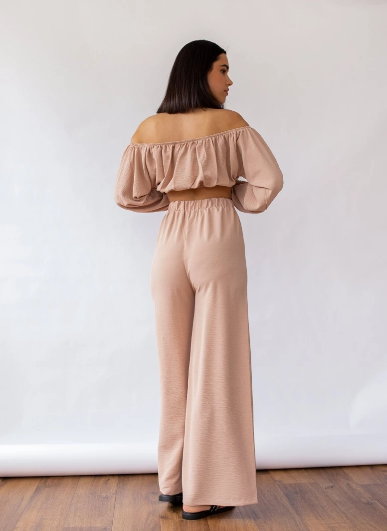 Σετ ρούχων.Το παντελόνι είναι wide leg ψηλόμεσο με λάστιχο στη μέση.Το τοπάκι είναι strapless σε cropped γραμμή με λάστιχο στα μανίκια και το τελείωμα.